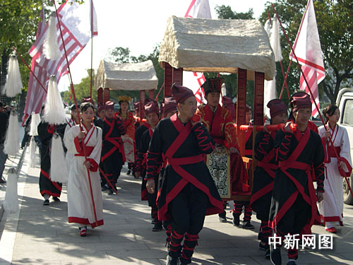 2008新年伊始,浙江省臺(tái)州市一行人身著漢服在莊重而又喜慶的古樂伴奏下,昂首闊步向市中心廣場走去。經(jīng)了解得知,這是臺(tái)州市首次舉辦的傳統(tǒng)漢民族婚禮展示。活動(dòng)由傳統(tǒng)漢民族婚禮表演、漢民族婚服展示、傳統(tǒng)漢婚有獎(jiǎng)知識(shí)問答三部分組成。