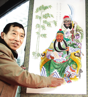 年畫這門原先日漸凋零的傳統(tǒng)藝術(shù),正隨著國家對民族文化的振興而復(fù)興。不過,剛呈現(xiàn)出興旺的勢頭,就有一批假貨跟進(jìn),在今天于三山會館開幕的“花樣年畫——海上年俗系列展之二”上,來自天津楊柳青、山東濰坊和河北武強(qiáng)的三位具有代表性的年畫藝術(shù)家,對此不約而同地嘆起了苦經(jīng)。