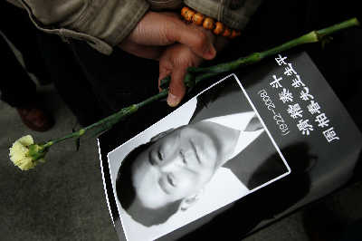 2點半,追悼會正式開始,大約600多位周柏春生前的摯親友好聚在大廳,為他送行。周柏春安詳?shù)靥稍邗r花叢中,接受大家的默哀和鞠躬。而此時,大廳門外的群眾已經(jīng)里三層外三層,很多人甚至難掩激動之情。