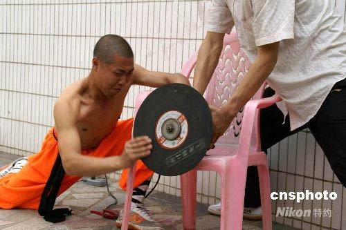 記者在比賽場上看到,當(dāng)胡瓊拿著一把鐵鉗貼向高速運(yùn)轉(zhuǎn)的切割機(jī)時(shí),頓時(shí)火星四濺。只見胡瓊扎上腰帶,凝神運(yùn)氣,大喝一聲后伸用手抓向切割機(jī),切割機(jī)立即停止了運(yùn)轉(zhuǎn)。連續(xù)兩次表演都非常成功,目瞪口呆過后的觀眾報(bào)以熱烈的掌聲。