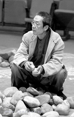 在演出現(xiàn)場記者看到,小劇場前排的座椅都已拆除,在舞臺下空出一塊正方形區(qū)域,幾百塊大小不一的鵝卵石堆放在演出區(qū)域內(nèi),1個多小時的演出就在這些石頭中進(jìn)行。盲人演員手持盲杖小心地邁出每一步,有了這些石頭做定位標(biāo)志,他們走臺時不再那么茫然。因座椅被拆除,每次演出只能容納200名觀眾。