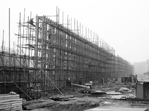 6月30日,記者在“唐山地震遺址紀念公園”的工程現(xiàn)場看到,盡管剛下過大雨,地上一片泥濘,但滿載沙石、物料的大貨車照舊進進出出,壓路機、大鏟車、小叉車也是隆隆作響。一排新建的鋼筋混凝土骨架像一道巨大的屏障,將整個工地截成南北兩塊。在它的西側(cè),已經(jīng)保存了32年的原唐山機車車輛廠鑄鋼車間地震遺址,在一層霧氣的籠罩中依舊桀驁地挺立在那里。
