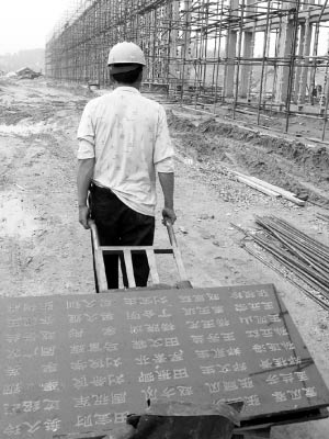 一位工人正把刻好地震罹難者名字的大理石塊運到工地。