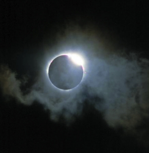 其次是日冕,當(dāng)貝利珠消失,月亮把太陽安全擋住,立即可以在黑太陽圓面的邊緣看到了一圈紅色的色球?qū),有時(shí)還能看到從色球?qū)訃姲l(fā)出的白色日珥;隨即色球?qū)右脖辉铝琳谧。綍r(shí)看不到的太陽外層大氣———日冕就露出了“尊容”,它那呈現(xiàn)放射開頭的珍珠色光芒,好像給太陽戴上了一頂帽子。此時(shí),在黑暗的天空中,往往還能看到金星和木星等行星,以及其他明亮的恒星。