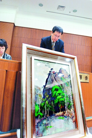 “快看,肯定是那幅畫!鄙衔9時,在旁聽人群的一陣騷動聲中,用塑料薄膜包裹著的大方框被抬進(jìn)一中院的法庭。金茂律師事務(wù)所的王建軼律師打開包裝,一幅油畫展現(xiàn)在眾人面前。“這是幅假畫!蓖踅ㄝW律師說,他的委托人蘇敏羅以230萬元的價格從北京翰海拍賣有限公司拍得這幅畫,而此畫當(dāng)時被介紹為吳冠中的作品。