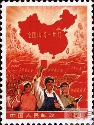 1968年9月“文化大革命”期間,全國除臺灣省外29個省、直轄市、自治區(qū)均成立了革命委員會。為紀念和慶祝這一事件,郵電部決定于1968年11月25日發(fā)行1枚“全國山河一片紅”郵票。面值8分。郵票圖案為工農(nóng)兵手持《毛主席語錄》,背景中“革命委員會”的紅旗匯成的紅色海洋和工農(nóng)兵群眾熱烈歡呼的場面,上方為一幅中華人民共和國地圖,地圖上除臺灣省外全部繪成大紅色,上面印有“全國山河一片紅”金字,郵票票幅為30毫米×40毫米,齒孔11.5度×11度,整張枚數(shù)50(10×5)。影寫版。北京郵票廠印制。集郵者稱為“一片紅”。