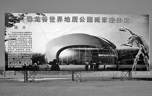 在諸城市政府網(wǎng)站上,關(guān)于最新的招商引資項(xiàng)目中,就有兩個(gè)關(guān)于建設(shè)恐龍化石地質(zhì)公園的項(xiàng)目。在臧家莊發(fā)掘現(xiàn)場(chǎng),一個(gè)蛋殼形狀的場(chǎng)館規(guī)劃圖屹立在發(fā)掘現(xiàn)場(chǎng)。工作人員介紹說,自2008年以來(lái),先后在此出土大量恐龍化石,該化石群規(guī)模之大、品種之多世界罕見,是古生物科考的重大發(fā)現(xiàn)。為保護(hù)好該化石群,諸城市決定在此建設(shè)恐龍谷世界地質(zhì)公園分館。該館外形設(shè)計(jì)為裂開的恐龍蛋殼形狀,寓意新發(fā)現(xiàn)、新收獲、新希望。館內(nèi)展示主要采取底層立體展示、化石平面展覽、 地下化石層隧道展示等,項(xiàng)目占地約100畝,建筑面積3500平方米,總投資2000多萬(wàn)元,于2008年9月開工建設(shè),計(jì)劃2009年7月1日前建設(shè)并投入運(yùn)營(yíng)。分館建成后,與恐龍谷世界地質(zhì)公園主場(chǎng)館遙相呼應(yīng),形成“一龍一蛋” 的旅游格局!敖ǔ芍蟠蠹揖涂梢皂樦鎏莸降叵,看看發(fā)掘現(xiàn)場(chǎng),看看恐龍化石,這些在不遠(yuǎn)的將來(lái)都會(huì)實(shí)現(xiàn)!惫ぷ魅藛T告訴記者。工作人員所說的主場(chǎng)館,就是即將建立在這次發(fā)掘出最大鴨嘴龍化石的庫(kù)溝村村北。在這條東西走向的化石隆起帶上,將建成一座全新的恐龍化石地質(zhì)公園。“ 這里發(fā)掘的恐龍化石,顏色還真挺特別,紅色、褐色的特別多,可能與這里的土質(zhì)有關(guān)吧!周圍都是紅土。 而在臧家莊那邊,發(fā)掘的化石顏色大都是黑色或者白色!