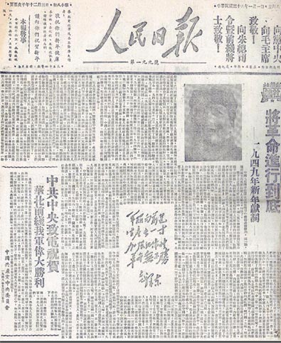 3.1949年1月1日《人民日報》第1版刊登的新華社社論《將革命進(jìn)行到底 ——一九四九年新年獻(xiàn)詞》