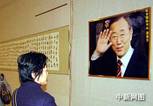 中新網(wǎng)南寧1月11日電(記者 劉萬(wàn)強(qiáng))聯(lián)合國(guó)秘書長(zhǎng)潘基文“亮相”中國(guó)廣西博物館正在舉行的2009年潘氏迎春書畫藝術(shù)作品展上,在該項(xiàng)展覽中,潘基文作為潘氏名人,他的兩幅照片被掛在展廳內(nèi)的顯著位置。