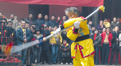 參賽人員中,年齡最大的徐先玉老太今年已72歲,她是著名的“長(zhǎng)江大俠”呂紫劍高徒之一。她的3節(jié)棍舞得虎虎生威,時(shí)而踢,時(shí)而戳,時(shí)而伏,贏得觀眾一片叫好。據(jù)徐介紹,當(dāng)年她出生3天母親就因病過(guò)逝,父親作為國(guó)民黨的一名軍官,四處打仗無(wú)法管她,她被武功超強(qiáng)的姑姑收養(yǎng),并拜她為師。有一次,投誠(chéng)后的父親在監(jiān)獄里偶然與“長(zhǎng)江大俠”呂紫劍相識(shí),遂托他尋找流落在重慶的女兒。