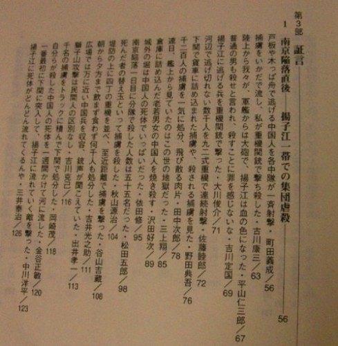 在下關(guān)刑場附近,從城中開來滿載中國人的敞篷卡車絡(luò)繹不絕,停在倉庫中間。作為海軍軍官的奧宮認(rèn)出這支部隊屬于第九師團(tuán)第三十六聯(lián)隊,他走進(jìn)碼頭的倉庫群,看到兩手被綁在背后的十幾個中國人,被一個個拉到江岸邊幾米的地方,用軍刀和刺刀慘殺后,投入揚(yáng)子江中。江中只見層層疊疊的尸體,靠近岸邊的江水為之阻塞,以肉眼幾乎難看出的速度裹挾著尸體艱難流向下游。但,有些人還沒有徹底死透,掙扎著向岸邊淺灣處逃生,那附近已經(jīng)是一片血海,因為那里等待他們的,是早有準(zhǔn)備的槍擊和刺刀。整個過程如同流水線一樣秩序井然,連大聲指揮的人都沒有?磥,明顯是根據(jù)上級的命令在進(jìn)行。我向刑場入口的一個下士問道:"這么多中國人,就這樣安安靜靜被帶來,你們是怎么做到的?"回答是:"城內(nèi),對著在廢墟上收拾的中國人問:'有肚子餓的舉手',然后把舉手的裝上卡車作出帶去吃飯的樣子,就完成了唄。""那么,為什么用日本刀和刺刀行刑呢?""長官說,為了節(jié)省子彈。"