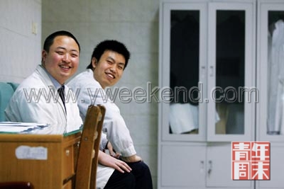 在整容室里,因?yàn)橥g,張洋和張祺關(guān)系很好。張祺相對(duì)活潑點(diǎn),他跟張洋講起昨晚做過(guò)一個(gè)夢(mèng),夢(mèng)見一哥們掉水里了。在夢(mèng)里他哈哈地樂著!鞍滋觳荒苄,晚上做夢(mèng)才能笑!睆堨靼腴_玩笑地說(shuō)。有時(shí)候,哥倆做久了這份工作也感到壓抑,晚上必須找朋友喝酒。朋友都會(huì)好奇他們的工作,都覺得怎么也得一月上萬(wàn)。張洋跟記者嚴(yán)肅澄清:真的只有3000多,非常普通的工資標(biāo)準(zhǔn)。