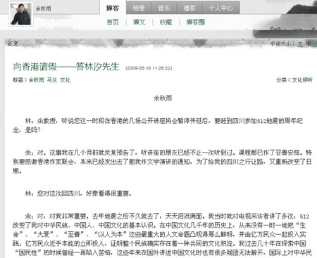 而今,汶川地震周年紀(jì)念將至。2009年5月10日,余秋雨更新自己在新浪所開設(shè)的博客,文章主題即是地震。在這篇題為“向香港請(qǐng)假——答林汐先生”的博文中,余秋雨以答問的方式,談了自己對(duì)汶川地震的一些看法。