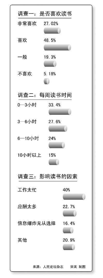 為了解干部讀書現(xiàn)狀,人民論壇雜志社近日在全國范圍內(nèi)組織了“萬名黨政干部閱讀狀況調(diào)查”。結(jié)果顯示,七成多的黨政干部讀書的愿望強烈,但由于工作忙、應(yīng)酬多等原因,33.4%的受訪干部每周的讀書時間為0—3小時,27.6%為3—6小時。