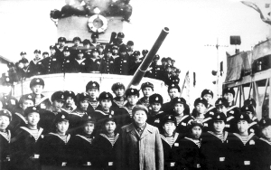 在艦上,毛主席看望了戰(zhàn)士們以后,便到了后主炮“130”大炮的前面看操演。馮尚賢開始指揮來這里接受檢閱的艦艇,毛主席看了很滿意。之后,一行人就到了會議室。