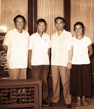 1961年7月初,我們在北京工作的堂兄爾輝結婚,因為他祖母和母親都在淮安老家,伯伯和七媽為他們在西花廳舉辦了婚禮,飯前參加婚禮的三十多人一起照了相,我去晚了沒趕上。飯后,七媽拉住我說:“你來晚了,沒趕上照相,又要參軍走了,來和伯伯照個相吧!本S世姐姐說:“金山也來晚了,一起照吧!庇谑怯辛松厦娴倪@張照片。