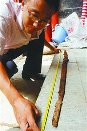 這次出土的幾件鐵器也引起了李銘的興趣。他告訴記者,別小看了這些鐵器,在漢代,這樣的鐵器屬于高檔品,不是一般人能用 的,更不是一般人能享受這樣的陪葬品的。這次出土的鐵器最重要的有3件。第一件是一柄鐵劍,已經(jīng)斷裂為5截,經(jīng)拼接后測量,其長大約1.15米。雖然劍體 銹蝕嚴重,但依然能看出質(zhì)地優(yōu)良,制作講究。劍柄的造型還基本清晰,劍箍為青銅制作。從這柄劍上,我們可以推斷很多當時的情況,如劍長1.15米,比現(xiàn)在 一般的劍要長,這就說明使用這柄劍的人身材比較高大;根據(jù)劍的形制,可初步認定是濟南當?shù)刂谱,如果通過科技手段研究出劍的鐵質(zhì)及其他合金含量,這對研究 漢代時期濟南地區(qū)的冶煉史有重要的參考價值。再說鐵鼎和鐵釜,它們都是漢代時期的生活用具。其中,鐵鼎為雙耳三足折腹鼎,形狀很好。雖然現(xiàn)在看銹蝕嚴重, 但在當時不是一般人家能夠使用的,不是官員,至少也是大戶人家,所以這對研究當時的社會生活和陪葬習俗都有重要價值。