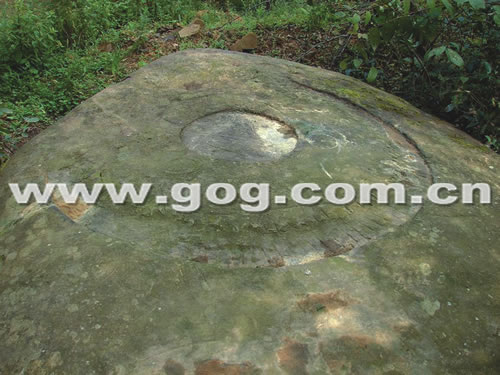 最為明顯的是巨石表面用鐵器鑿成的圓形圖案,該圖案是由一個直徑約1.5米未連接的半圓,圍住一個直徑約0.6米的小圓,半圓的線條是被鑿凹進去的,每隔約3厘米便有一根豎線,而被圍在中間的圓心也是陰刻的,上面縱橫著鑿刻的線條,在圓心兩側(cè),還有兩個星形的小圓圈。