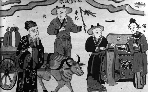 詩中的牛郎、織女分隔于天河兩岸,男的放牛,女的紡織,終日辛勤勞作,但因煩擾于彼此的無盡相思而收效不大,詩中可以使人隱約感覺到二人相望而不能相聚的幽怨之情!对娊(jīng)》中這種隱隱約約的表達方式,就構(gòu)成了后世這一傳說的基礎(chǔ)。至《史記·天官書》中,便有了“織女,天女孫也”的說法。于是,在漢代的詩文中,就增加了故事的許多內(nèi)容,對女主人公因被迫分離而造成的痛苦的描寫更具體化了。如《古詩十九首》中的《迢迢牽牛星》詩: