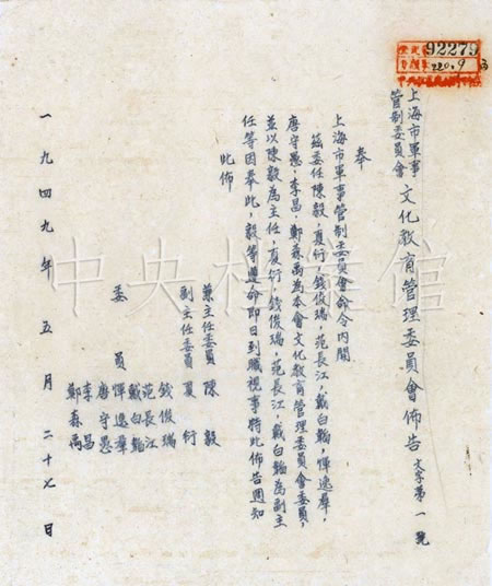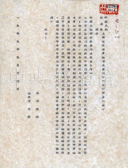 上海解放后,上海市軍管會成立,下設軍事、政務、財政、文化教育四個方面的接管委員會。1949年5月29日,上海軍管會文化教育管理委員會派軍代表接管大中華唱片廠。6月2日,大中華唱片廠恢復生產,灌制了解放區(qū)歌曲《解放區(qū)的天》、《軍隊向前進》、《唱勝利》、《蔣家兵呀一團糟》、《向人民解放軍致敬》、《扭向新中國》、《快樂的農村》等七種,準備由各廣播電臺播送。8月,以“人民唱片”為牌號出版唱片。到年底,共出版60個牌號,約1萬張粗紋唱片,其中有歌曲《東方紅》、《國際歌》、《咱們工人有力量》、《贊美新中國》以及歌劇、民樂、京劇、越劇、川劇、滬劇、山東快書等。