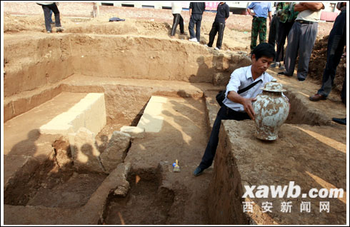 在地宮墓葬南側(cè)約4米遠(yuǎn),考古人員還發(fā)掘出一個(gè)更為少見的墓葬。這是一個(gè)距現(xiàn)地表約1米深的長方形豎穴墓坑,長約1.5米,寬約0.8米,其內(nèi)置放一個(gè)高約70厘米、直徑約80厘米的大陶缸,缸口用一大陶盆覆蓋,內(nèi)中有一具呈盤坐姿態(tài)的完整骨架,周圍填有木炭屑及麥草等。張全民介紹說,這是一個(gè)僧人的坐化真身,即其彌留之際以盤坐姿待逝,留下完整尸身歸葬。其葬式也可稱甕棺葬,所填充的木炭等物用以吸潮防腐,也確實(shí)起到了作用。