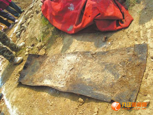 第二天上午記者聞訊趕到現(xiàn)場,見到一座五六米高的土坡被掘去一半,古墓的白灰空洞懸在土坡切面的半腰處,棺木散落在土方旁。泥地上有一大攤水漬,有人提醒道,別踩著,那是從棺材里流出來的水。女尸已被人用廢舊的紅地毯裹卷著,停放在不遠(yuǎn)處的平地上,旁邊還有一張潮濕的舊篾席。后來獲知席子原先墊于尸首下,是從棺木中取出的。仔細(xì)一打量,篾席上長時間壓出的人形痕跡清晰可見。圍觀的人越來越多,不時有人上前,欲掀開地毯一睹新奇,好在兩個民警一旁維持秩序,好事者才不敢妄動。