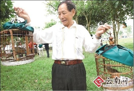 上午11點,結(jié)束了當天的鳥市后,勐捧農(nóng)場武裝部職工何保平的一只畫眉鳥得到了冠軍!氨緛砣ツ暧腥碎_價1.5萬元都沒有搞到手,不過今年由于它原來的主人忙著要去打理生意,被我3600元就撿個大便宜買了下來!焙伪F脚d奮地對記者說:“不過,我們這里有一個沒有人敢挑戰(zhàn)的鳥王!闭f話間,他將記者領(lǐng)到了一位正把玩著兩個鳥籠、精神矍鑠的老人面前,告訴記者,他就是這一帶公認的“鳥王”張陸成。