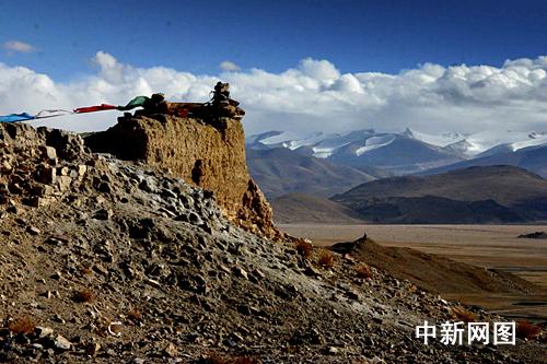 崗嘎鎮(zhèn)黨委書記達(dá)瓦次仁告訴我們,這座山名為“崗嘎山”。在山頂,碎石遍布,但還能清晰地看出關(guān)帝廟墻腳的走向。山頭懸崖處,是藏民擺放的瑪尼堆,還有迎風(fēng)飛舞的五彩經(jīng)幡。放眼望去,幾十公里外,就是綿延不斷的珠穆朗瑪群峰。
