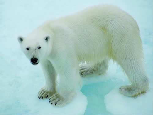 北極海冰也在不斷融化。1993年夏天,北極海冰覆蓋面積約為750萬平方公里。到2007年9月,北極海冰覆蓋面積僅剩430萬平方公里。據(jù)估計(jì),北極海冰即將面臨再一次的大面積崩塌。在北極海冰融化過程中,北極熊將是最大的受害者。圖中這頭雌性北極熊正站在一塊浮冰上在科考船周圍巡游。美國科學(xué)家曾經(jīng)在一份研究報(bào)告中警告,到2050年,北極熊或?qū)缃^。