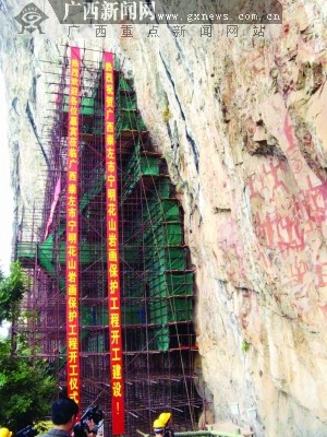 昨日上午,在簡(jiǎn)短而隆重的開(kāi)工儀式后,廣西崇左市寧明花山巖畫保護(hù)工程正式開(kāi)工。花山巖畫保護(hù)前期工作長(zhǎng)達(dá)18年,僅在方案研究、材料試驗(yàn)和方案設(shè)計(jì)等工作上就耗時(shí)5年,其所動(dòng)用的學(xué)科領(lǐng)域和專家之廣、所耗資金之多,不僅在廣西文物保護(hù)史上史無(wú)前例,就是在中國(guó)文物保護(hù)史上也極為罕見(jiàn),而此次開(kāi)工的第一期搶救性加固工程被專家稱為“要干救命的活”。那么等著“救命”的花山巖畫其病害危重到什么程度?為什么前期工作要花費(fèi)那么長(zhǎng)時(shí)間?一期保護(hù)工程將使用哪些先進(jìn)技術(shù)?我們以后還能不能看到它的原貌?記者在保護(hù)工程現(xiàn)場(chǎng)進(jìn)行了采訪。