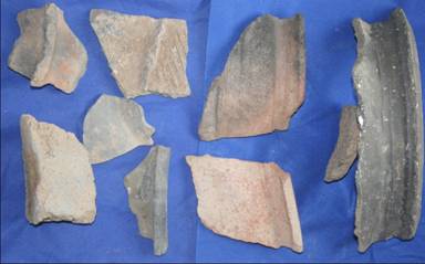 另在遺址東部的取土坑內(nèi)暴露一陶窯遺跡,陶窯開口距地表1米,窯的剖面為半圓形,直徑2.3米,殘高0.8米,底部紅燒土厚4厘米,上部灰燒土厚3厘米,窯內(nèi)由磚塊、燒土塊,灰土、繩紋灰陶罐片等。地表散落有大量的遺物。