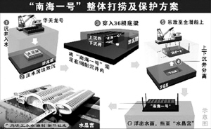 2007年11月13日,工程技術(shù)人員特別是潛水員經(jīng)過(guò)60天苦戰(zhàn),終于將已經(jīng)裝有“南海一號(hào)”的巨型鋼沉箱的36根底托梁全部穿引完畢,隨后,施工人員在底托梁之間的空當(dāng)穿進(jìn)37 塊厚度為12毫米的鋼板,使底部密封,以保證起浮時(shí)沉箱中的泥沙不會(huì)外泄,確保古船不會(huì)受到損害。2007年12月22日,隨著“南海一號(hào)”整體打撈工程總指揮吳建成一聲令下,廣州打撈局為此次打撈特別定制的4000噸全回轉(zhuǎn)起重船“華天龍”和載重能力1.5萬(wàn)噸的“重任1601”半潛駁輪一起緩緩把裝載有“南海一號(hào)”的沉箱吊出水面。12月23日,在拖輪的牽引護(hù)航下,裝載著沉箱和“南海一號(hào)”的“重任1601”巨型駁輪被緩緩拉向陽(yáng)江海陵島的十里銀灘。在那片潔白的沙灘上,新建成的廣東海上絲綢之路博物館(也被稱為“水晶宮”)正在靜靜地等候著它的到來(lái)。12月28日,“南海一號(hào)”正式入住“水晶宮 ”。至此,“南海一號(hào)”整體打撈工作畫上圓滿的句號(hào)。