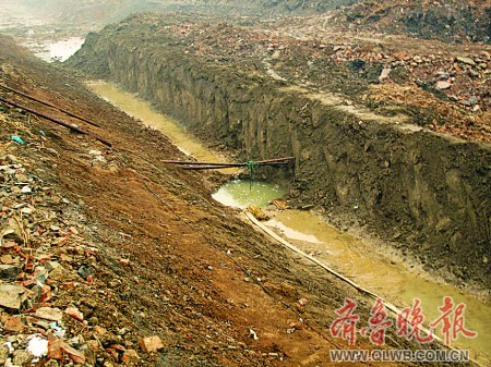 記者20日來(lái)到發(fā)現(xiàn)古墓的工地。因?yàn)橄掠,工地中一片泥濘。這個(gè)剛被挖出的宋元古墓在一條東西走向的河溝溝底,距離地面約五六米,墓口用兩根棍子示意。起初,墓穴的外形還比較明顯,隨著河溝一側(cè)的雨水向墓穴匯去,幾十分鐘的工夫便被淹沒了。