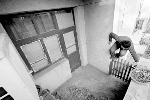記者看到,陽臺和樓道內(nèi)的屋門已鎖。陽臺上破損的窗戶尚未修復(fù),仍保留著警方勘察現(xiàn)場時所貼的標尺條。但窗戶內(nèi)側(cè)已用木板釘上,無法看清屋內(nèi)狀況。