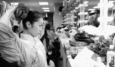 序幕里,周巖扮演的“和諧少女”在舞臺(tái)上空飛過,造型驚艷,一下子就調(diào)動(dòng)起了觀眾的情緒。但在第一次吊威亞培訓(xùn)時(shí),她哭了!盀榱税踩,腰上要系得特別緊!痹谔焐系踔臅r(shí)候沒有什么感覺,結(jié)果腳一著地,“就疼哭了”。