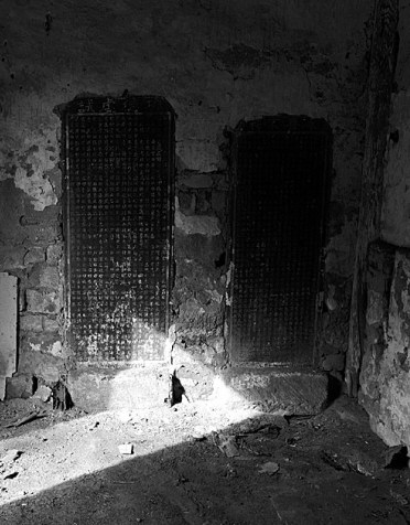 穿過平地,是龍虎殿,幾根樹干撐著屋檐,以防坍塌。站在門口,可以看到前方的大殿。但是,大殿只剩下幾面墻壁和幾根被燒焦的柱子。