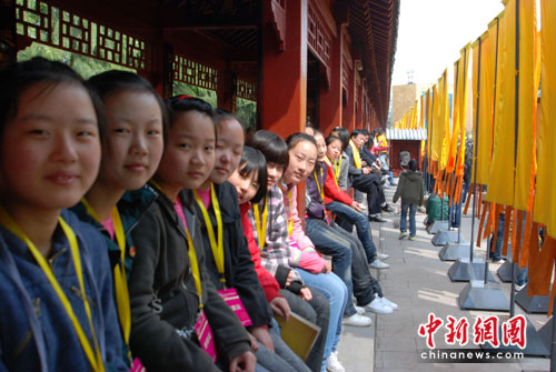 大典進(jìn)行時(shí),各項(xiàng)準(zhǔn)備工作就緒,拜祖場(chǎng)務(wù)人員在拜祖現(xiàn)場(chǎng)等候各項(xiàng)議程的工作安排,他們“忙里偷閑”和中新網(wǎng)直播主持人合影留念。參加放飛和平鴿的兩岸四地的小朋友們靜靜坐在亭子里等候。