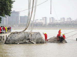 4股共8根白色的“繩子”從空中吊臂上垂下,已經(jīng)將一塊露出水面最多的不規(guī)則疑似巨石牢牢“網(wǎng)”住!坝率俊碧(hào)打撈船現(xiàn)場(chǎng)總指揮王雷告訴記者,打撈船自身重達(dá)萬(wàn)噸,這8根白色“繩子”應(yīng)該叫“高強(qiáng)度尼龍纜繩”,每根比一個(gè)成人的手臂都粗出許多,是由特殊材料定制的,造價(jià)不菲。“勇士”號(hào)上月28日進(jìn)入打撈水域后,就開(kāi)始馬不停蹄地為打撈做前期準(zhǔn)備,近50名專(zhuān)業(yè)打撈人員,輪換潛水進(jìn)入江底巨石所在位置,進(jìn)一步清淤后又用高壓設(shè)備沖泥,這樣將巨石臥江位置沖出一定空間。再將高強(qiáng)度尼龍纜繩穿過(guò)石體,到昨天才剛剛固定完畢。記者問(wèn)他,這些專(zhuān)業(yè)人士潛入江底,能否看到石塊上有字跡或其他古跡。王雷說(shuō),“潛下去后,水下的能見(jiàn)度為零”,同時(shí),因?yàn)閷?zhuān)業(yè)人士全身著特定的潛水打撈衣,手也無(wú)法感知。所有一切疑問(wèn)及待解之謎,看來(lái)只有留待巨石出水之時(shí)解開(kāi)了。