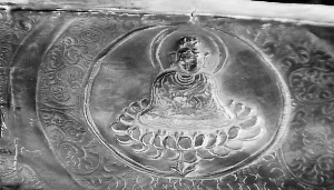 圣物供奉在全國工藝大師王殿祥親手設(shè)計(jì)制作的楠木刻金寶座上。這兩套楠木刻金寶座直徑有15厘米,高度為12.5厘米,寶座底座和下三層都是浮雕,圖案主要是一些蓮花等佛教紋飾,上面三層是蓮花花瓣。最上面一層采用圓雕手法“綻放”出朵朵蓮花。兩個(gè)寶座采用楠木雕刻,貼附金箔,寶座金光熠熠,莊重而華貴。