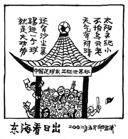 記者在采訪中同時了解到,華君武還是一位足球迷,2002年世界杯,中國隊出征韓國之前,他專門畫了一幅名叫《東?慈粘觥返穆嫛
