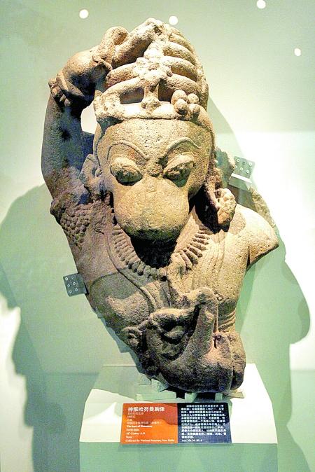 記者在2007年河南博物院舉辦的“西天諸神”展覽中見到過來自印度國家博物館的石質(zhì)“神猴哈奴曼胸像”(左圖)。這件神猴雕像雖然只存上半身,但形象確實酷似孫悟空。