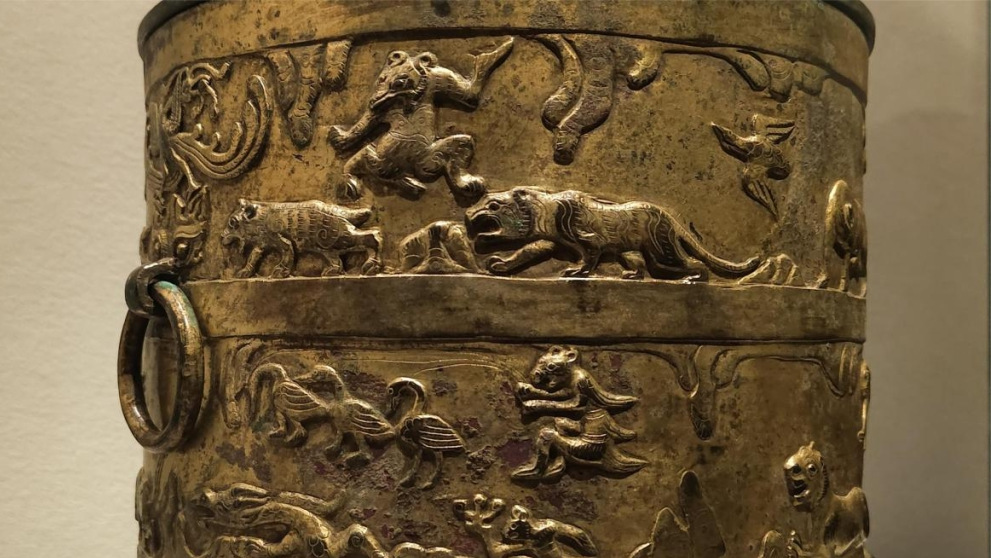 在山西博物院的“民族熔爐”展廳內(nèi),一對(duì)光彩奪目的鎏金銅樽引人注目。是什么原因使得中原元素與草原風(fēng)情同時(shí)出現(xiàn)在這件銅樽上?