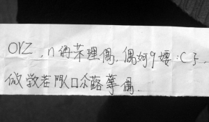 李女士的女兒剛剛上初中,前幾天,她為女兒整理書包的時候發(fā)現(xiàn)了一張字條:“orz,n侢芣理偶,偶妸9婹:(孒,倣敩茬閄囗尒蕗等偶”,上面大多數(shù)是一些看不懂的字,里面還夾雜了英文字母、數(shù)字和一些符號,很像是“亂碼”。李女士查閱了《康熙字典》和《新華字典》,字典上根本就沒有這些字,尤其是那些符號,怎么看也看不出里面有什么名堂。