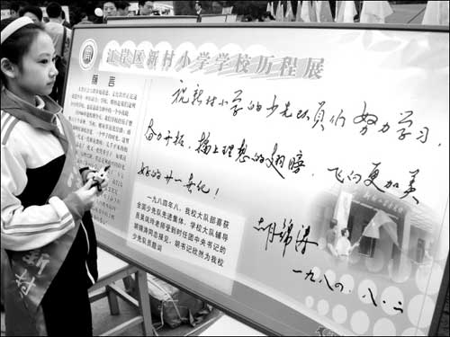 昨日,新村小學(xué)的學(xué)生在觀看胡錦濤總書記當(dāng)年的題詞!⊥ㄓ崋T 田立平 樂鋼 攝