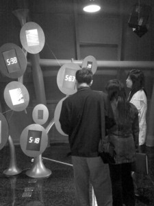 時(shí)間可以捕捉嗎?不斷流動(dòng)的時(shí)間如何直觀地表現(xiàn)?一件名為“時(shí)間之樹”的作品讓人切身體會(huì)到“光陰易逝”、“時(shí)不我待”,這件作品用顯示屏同時(shí)展示一系列與時(shí)間有關(guān)的影像,在這里時(shí)間被瞬間加速,時(shí)間數(shù)字和不同時(shí)間段的同一場(chǎng)景在這些鏡形顯示屏上交錯(cuò)呈現(xiàn),讓人頓生緊迫感。