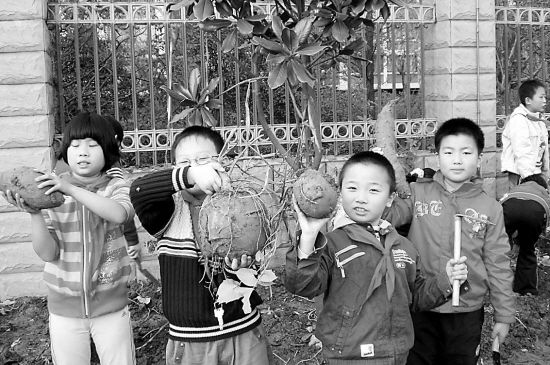 孩子們挖上來的番薯不但數(shù)量和體積相當驚人,連形狀也是千奇百怪。除了經(jīng)常能見到的長形的、橢圓形的番薯外,還有圓滾滾的,甚至是波浪形的,孩子們給這些番薯都取了名字,“絲瓜番薯”、“方便面番薯”,當然,最大的“番薯王”也有名字,叫做“地雷”。