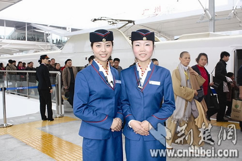 經(jīng)過三次試運(yùn)行,12月26日,京廣高速鐵路武廣段正式開通運(yùn)營,武漢火車站也同時投入使用。72名大學(xué)生“動姐”,正裝上崗,成為動車組上最靚的風(fēng)景。