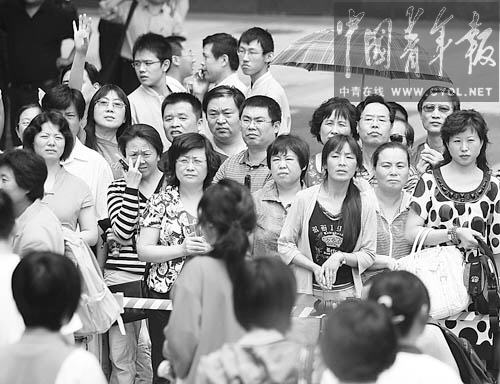 考試結(jié)束后,家長們紛紛探身張望著尋找自己孩子的身影。有家長從口袋取出塑料碗封好的點心,停在路邊的私家車也都發(fā)動起來,開著空調(diào)迎接。執(zhí)勤警察不斷地提醒家長后退,給考生讓路。瞬間,在校門口形成了兩排“夾道歡迎”的人群,“這里變成星光大道了,我們都是追星族啊!”一位家長調(diào)侃道,“真是可憐天下父母心啊”。