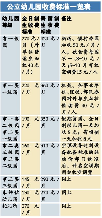 據(jù)介紹,公立幼兒園是屬于全市收費(fèi)最規(guī)范的層次,因?yàn)榘次飪r(jià)局規(guī)定,省一級(jí)、市一類園、市二類園、市三類園和未評(píng)估的幼兒園、托兒所,都有明確的收費(fèi)標(biāo)準(zhǔn)。公立園的每項(xiàng)收費(fèi)、標(biāo)準(zhǔn)及收費(fèi)許可證都須公示在公布欄。不過,這一層次也是目前全市幼兒園中最少的。