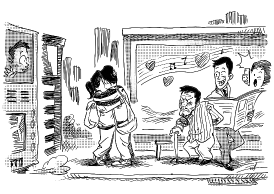 昨天本報熱線96068接到熱心讀者的來電,說在杭州天目山路八字橋車站每天下午5點半左右,經?匆娨粚χ袑W生戀人旁若無人地摟抱、接吻,一點也不顧忌周圍人的眼光,公交車來了也不上車!八麄兠刻於歼@樣,這個年紀應該學習要緊,你們記者去勸勸吧!”